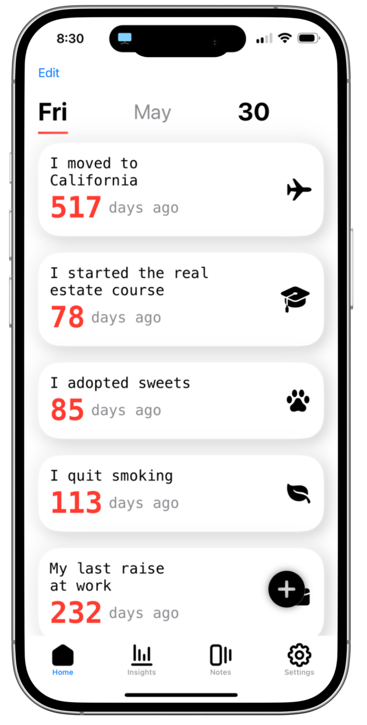an app that helps you track life’s meaningful moments, reflect with notes, and see your journey through beautiful insights.