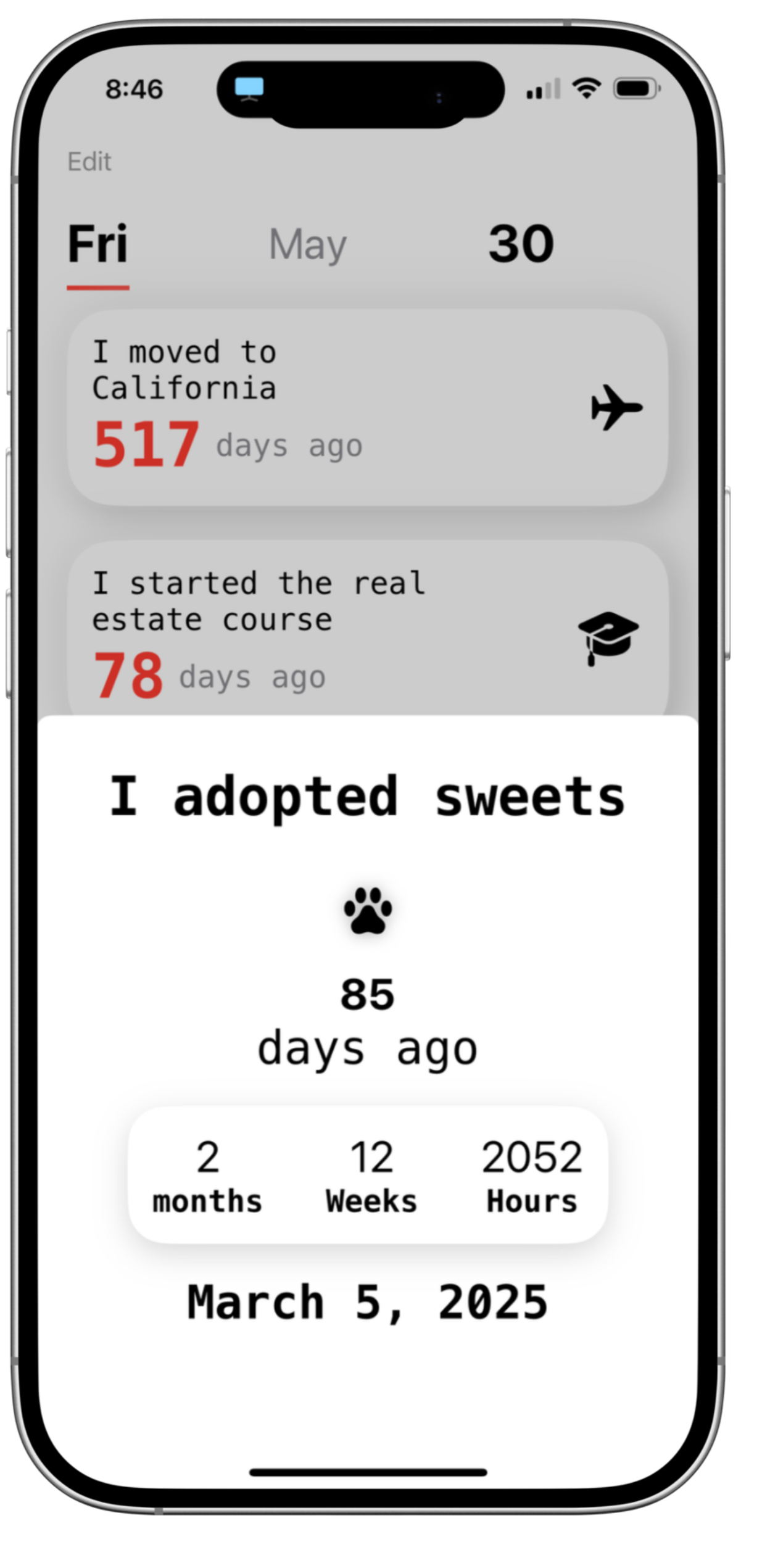 The View Event screen prominently shows the event title at the top, alongside its associated category icon for quick recognition. Just below, you’ll see a bold count of how many days have passed since the event occurred. At the bottom of the screen, a detailed breakdown shows the total time in months, weeks, and hours for deeper insight. The exact date of the event is also displayed, so you always know when it happened.