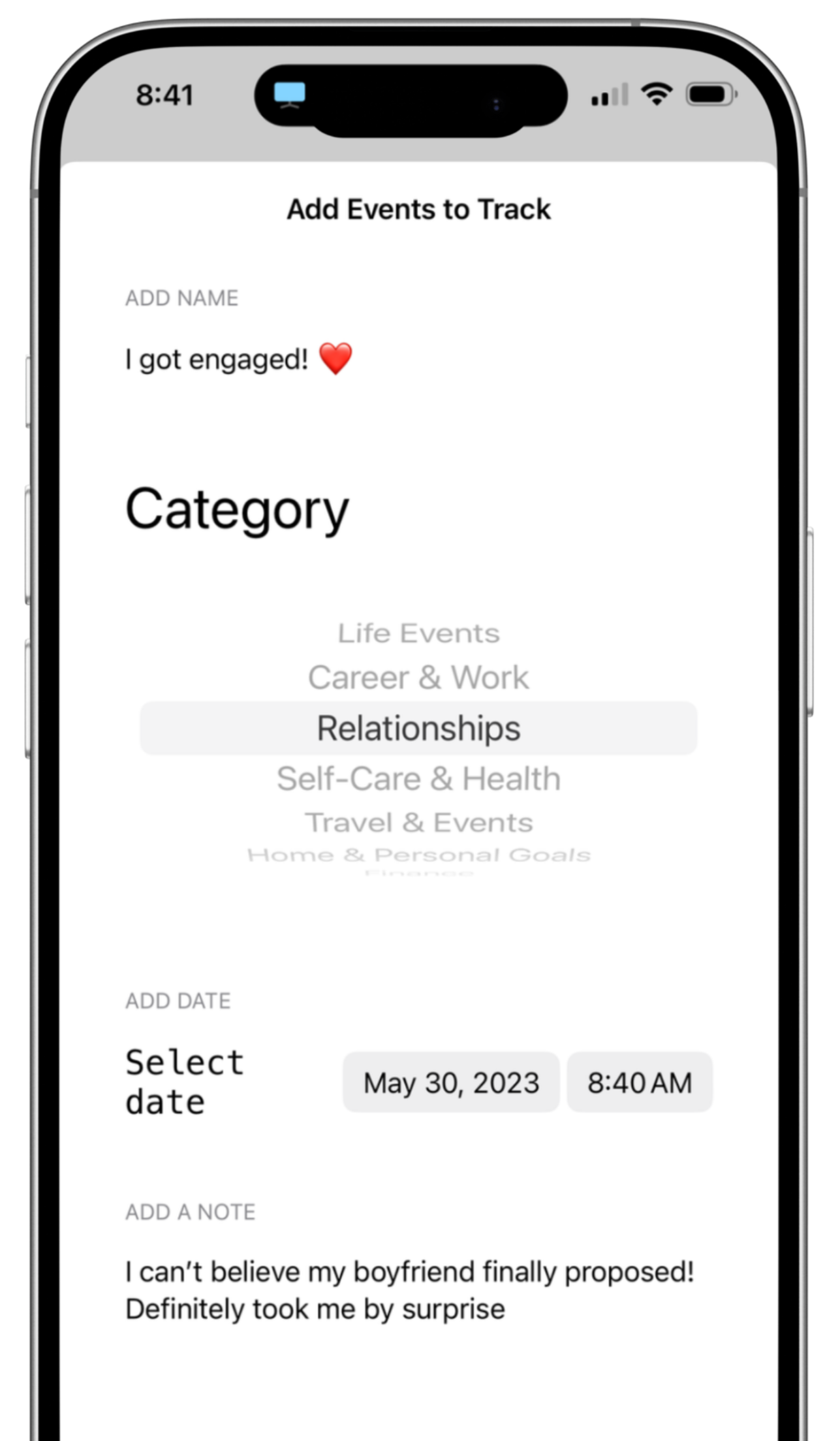 The Add Event screen begins with a simple text box where you can name your moment. Below, you’ll select a category that determines the icon used to represent the event. You can then choose the exact date the event happened. At the bottom, there’s an option to add personal notes — perfect for capturing thoughts, details, or reflections.