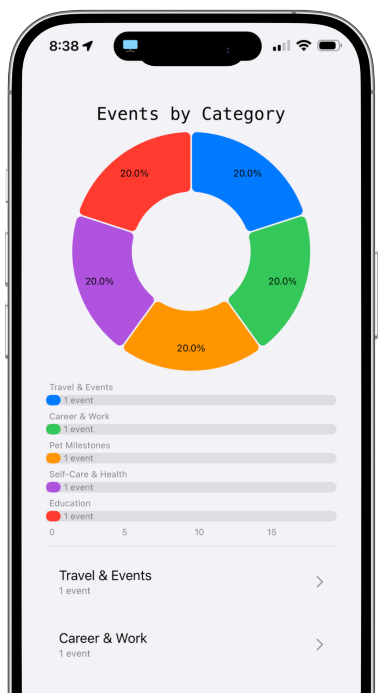 The Insights page features a donut chart and bar graph that transform your tracked moments into clear, visual data. The donut chart highlights how your events are spread across different categories, while the bar graph shows the percentage share and average time between events in each one. Beneath the charts, you’ll see a row of color-coded category blocks. Each block includes a label and a small line of text showing how many events belong to that category.